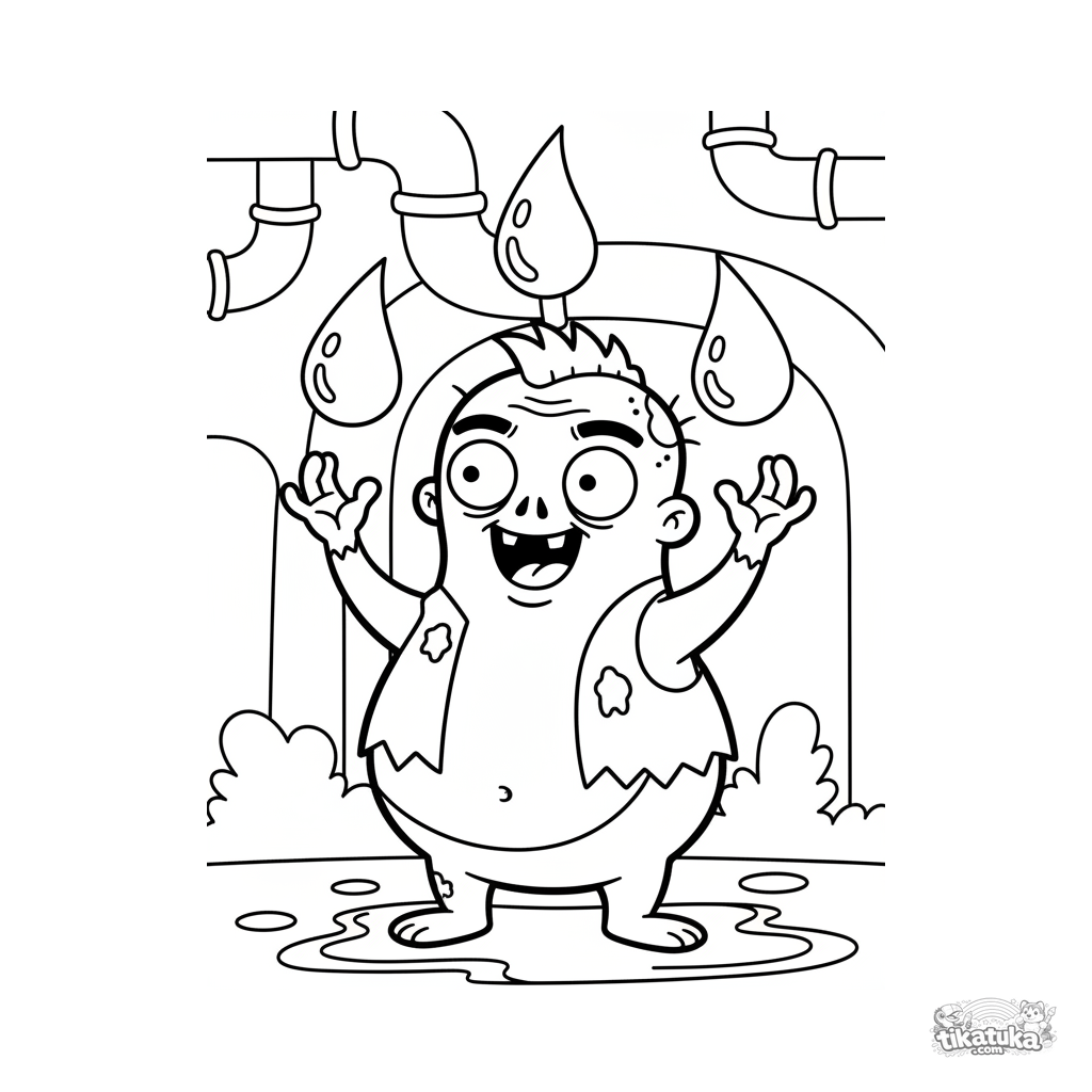 Página para colorir para crianças 7-9: um zumbi engraçado em um túnel de esgoto faz malabarismo com grandes gotas de água caindo de um cano. Cena dinâmica e divertida.