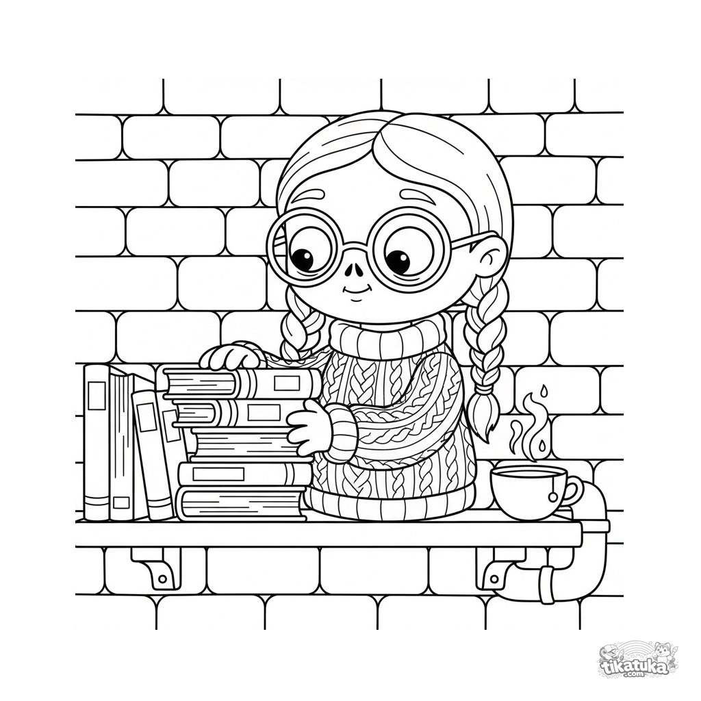 Página para colorir para crianças de 2-3 anos: um zumbi bibliotecário amigável organizando livros em um nicho aconchegante de um coletor de esgoto. Formas muito simples e grandes.
