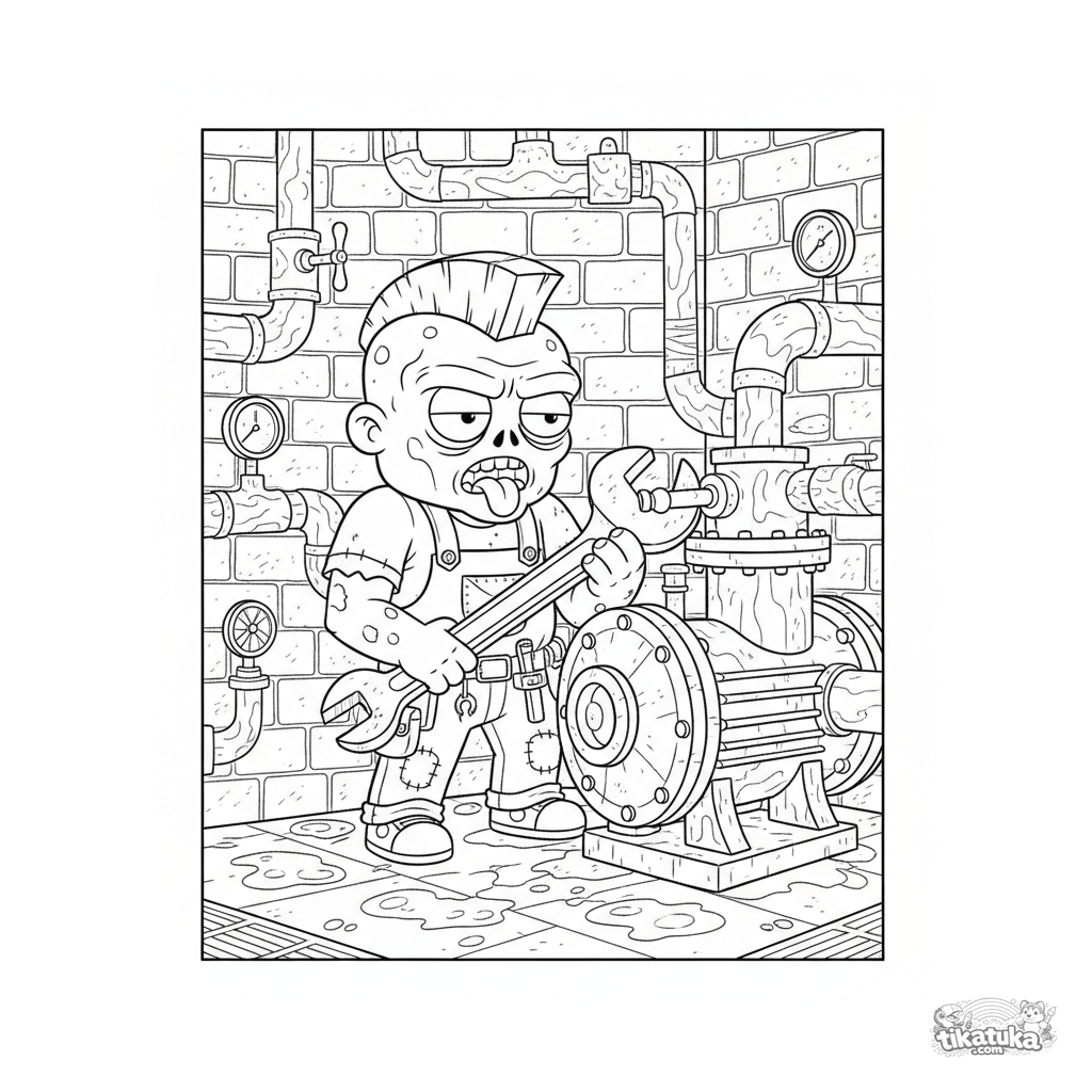 Página detalhada para colorir para crianças de 10-12 anos: um zumbi mecânico conserta uma bomba na sala de máquinas de esgoto.