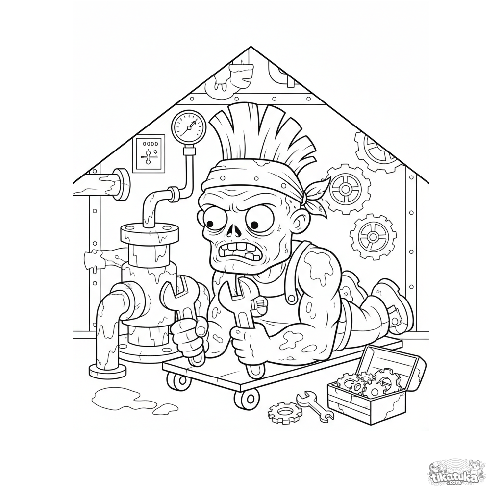 Página para colorir para crianças 7-9: um zumbi mecânico forte conserta uma bomba na sala de máquinas de esgoto. Estilo de quadrinhos de aventura, pose dinâmica.