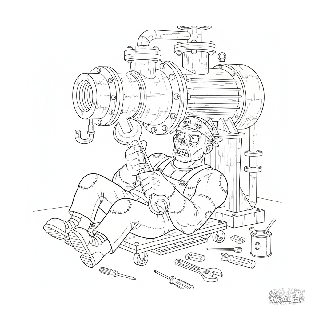 Página complexa para colorir para crianças 10-12 em estilo técnico: um zumbi mecânico com uma chave inglesa conserta uma grande bomba enferrujada em uma sala de máquinas de esgoto.