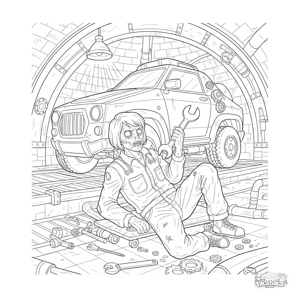 Página detalhada para colorir para crianças de 10-12 anos: um zumbi mecânico repara um veículo incomum em uma oficina improvisada em um coletor de esgoto.
