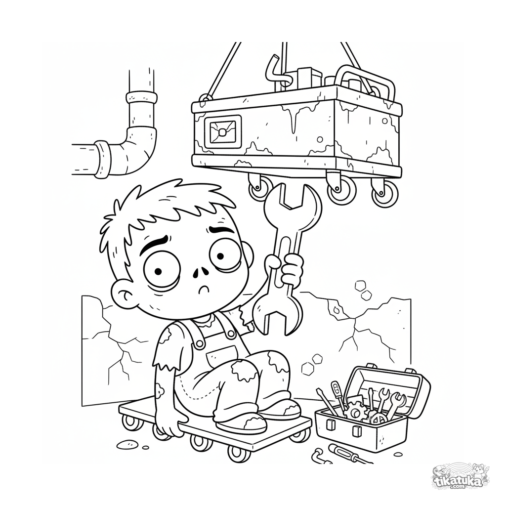 Página para colorir para crianças de 4-6 anos: um zumbi mecânico consertando um carrinho em uma garagem improvisada em um coletor.