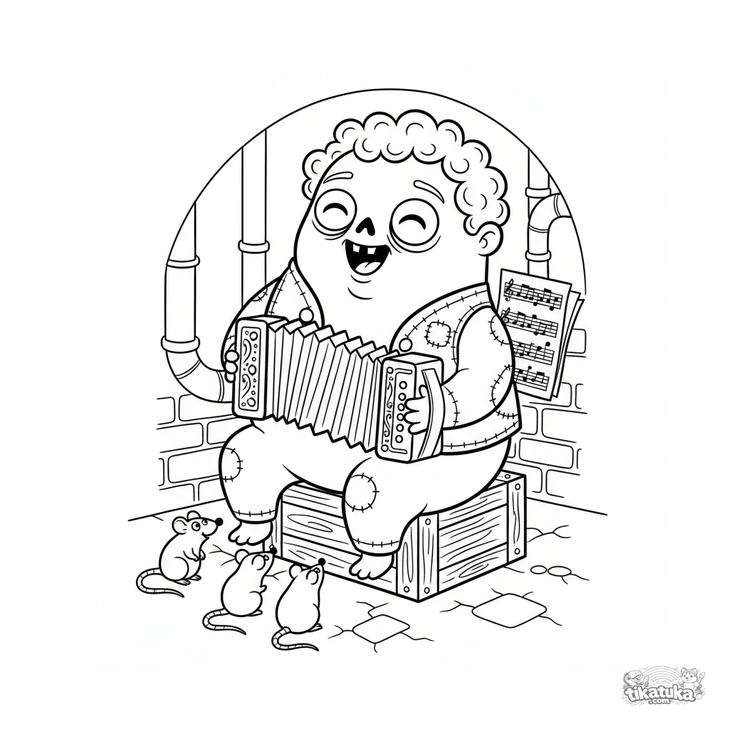 Página para colorir para crianças 4-6: um zumbi músico tocando acordeão em uma passarela de esgoto.