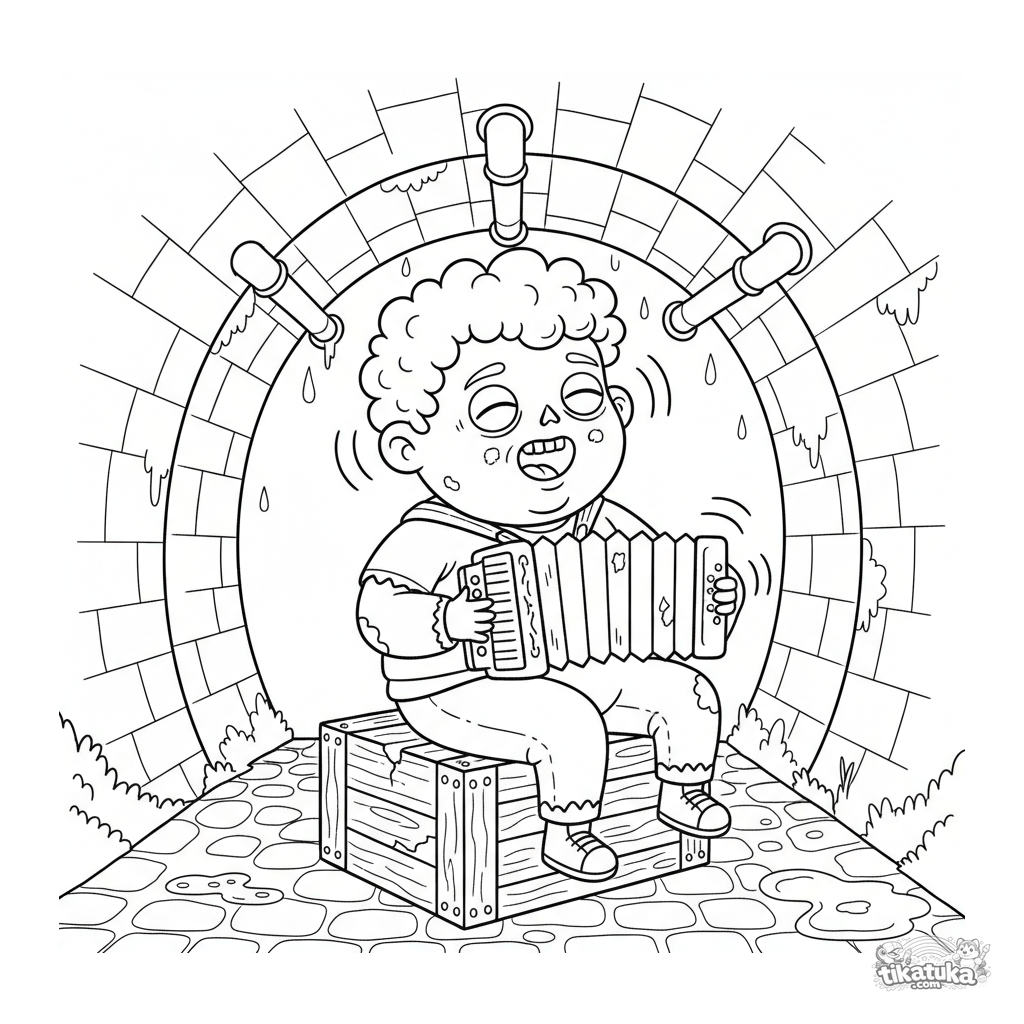Página para colorir para crianças 7-9: um zumbi músico tocando acordeão em um túnel de esgoto. Cena vibrante no estilo folclórico.