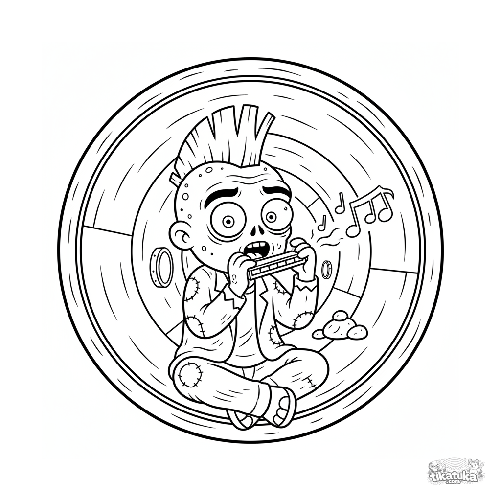 Página para colorir para crianças 7-9: um zumbi alegre com um moicano toca gaita sentado dentro de um grande cano de esgoto. Cena dinâmica com notas musicais.