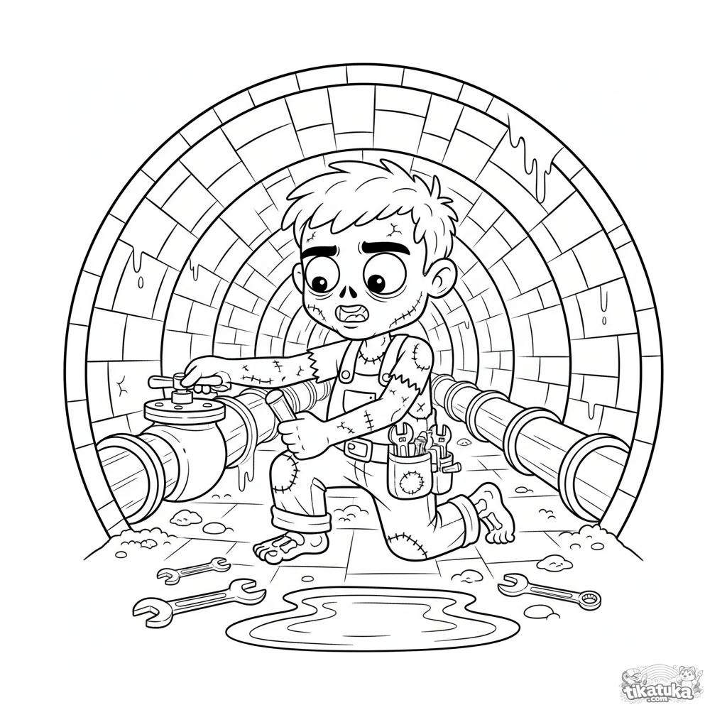 Página para colorir para crianças de 7-9 anos: um zumbi encanador trabalhando em um túnel coletor de esgoto. Perfeito para meninos.