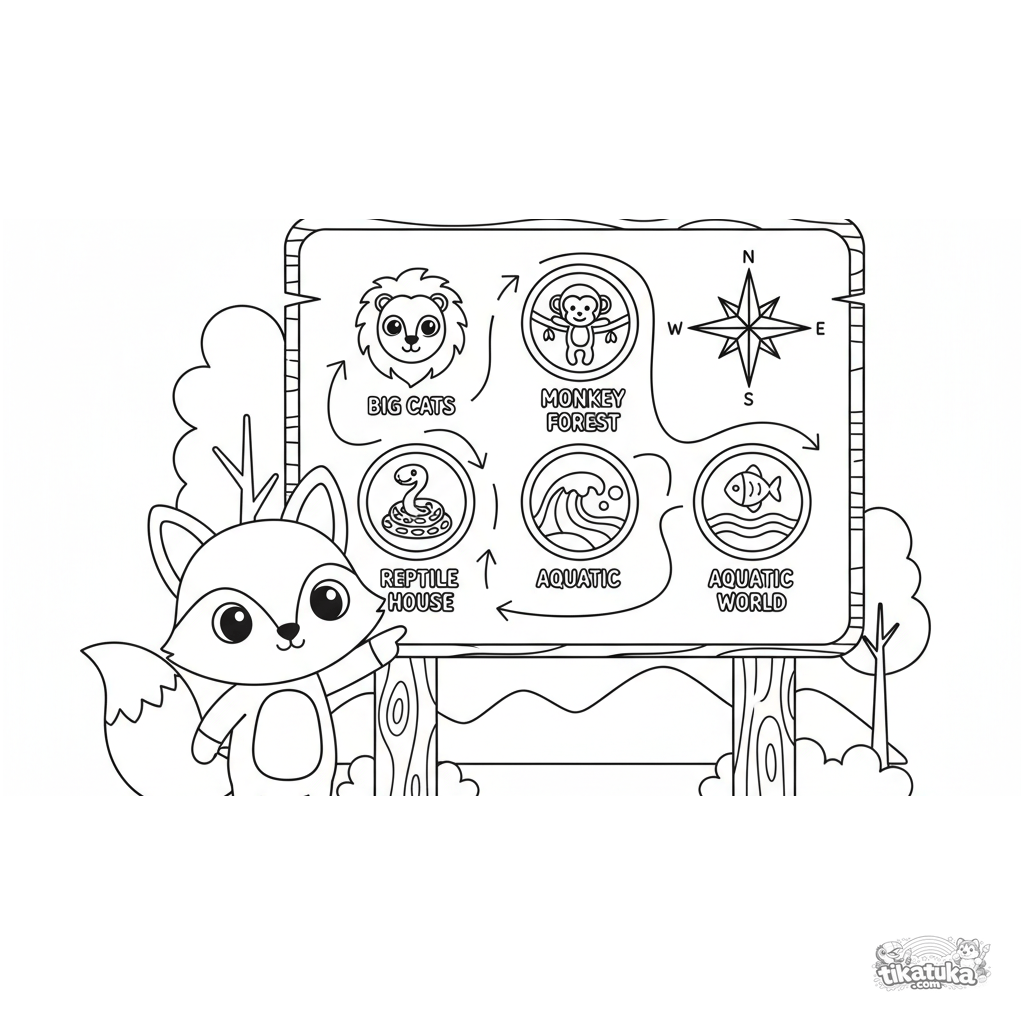 Página para colorir para crianças de 7-9 anos: um mapa grande do zoológico com rosa dos ventos. Uma raposa guia amigável aponta o caminho. Ensina orientação.