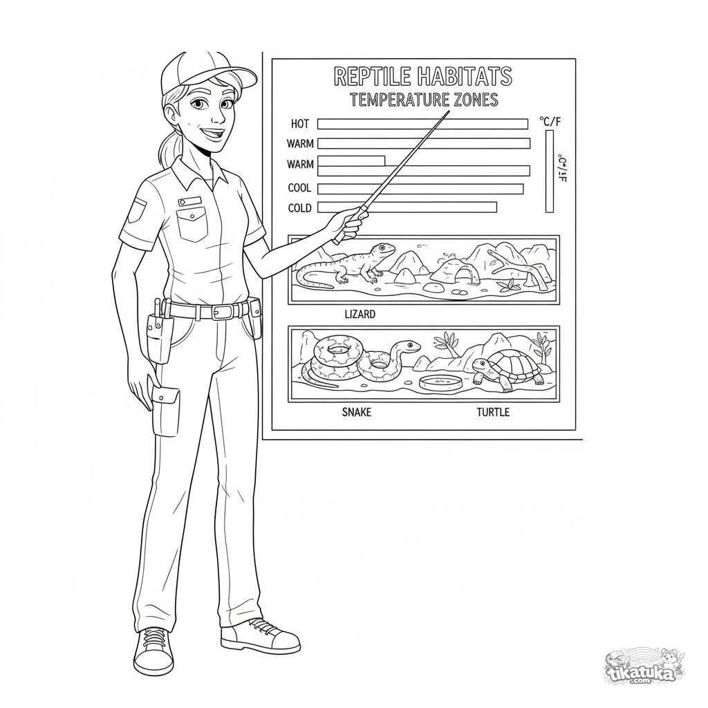 Página para colorir para crianças de 10-12 anos. Um voluntário do zoológico explica um gráfico de temperatura para répteis usando um quadro informativo. Ilustração científica detalhada.