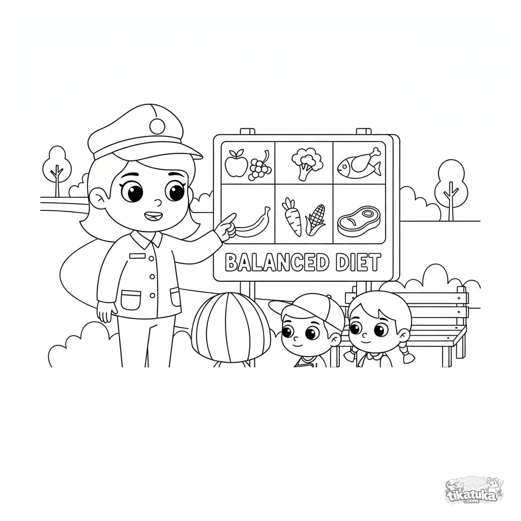 Página para colorir para crianças 4-6: um tratador do zoológico explica em uma placa o que os animais comem. Cena educativa sobre nutrição e profissões.