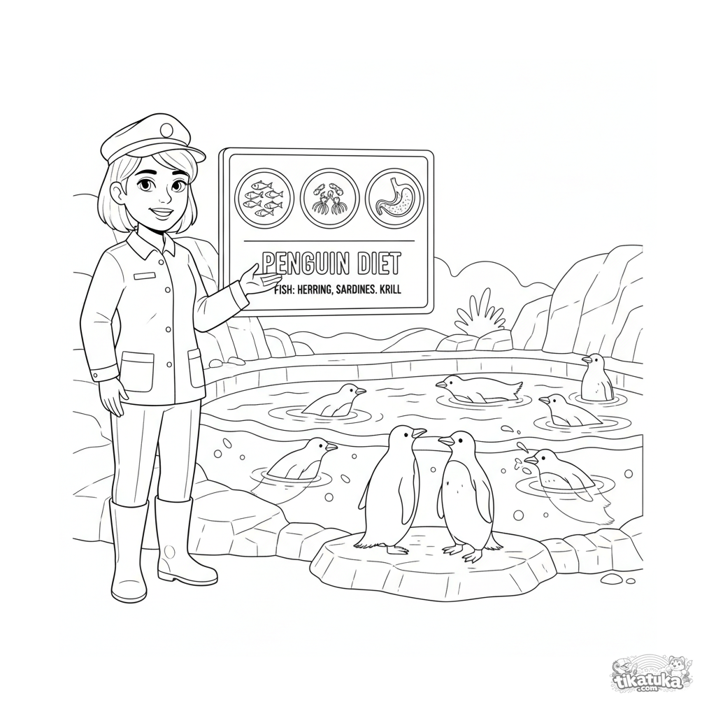 Página para colorir detalhada para crianças de 10-12 anos: um tratador explica a dieta dos pinguins em um quadro informativo.