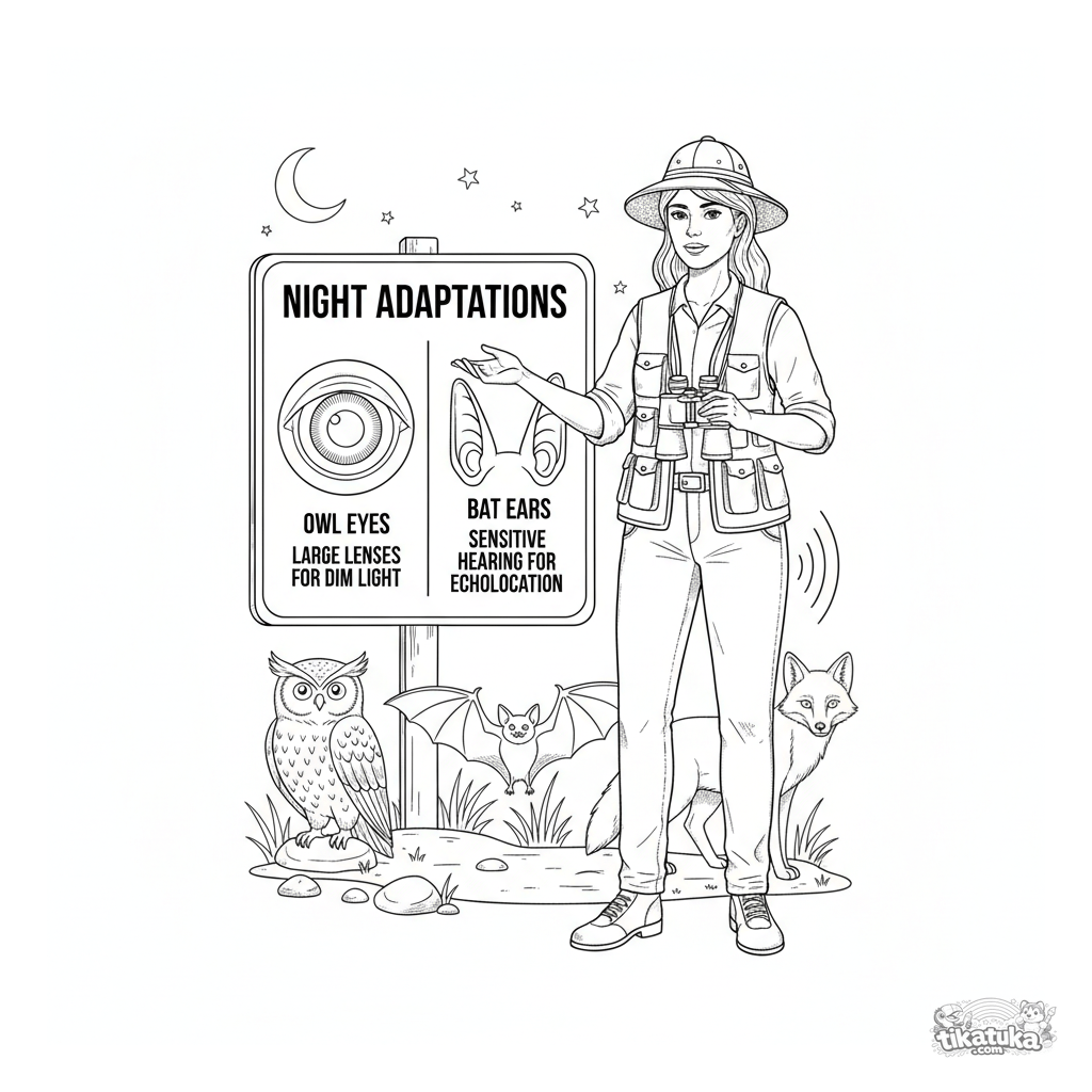 Página para colorir para 10-12 anos: um zoólogo explica adaptações complexas de animais noturnos a partir de uma placa informativa no zoológico. Ilustração científica detalhada.