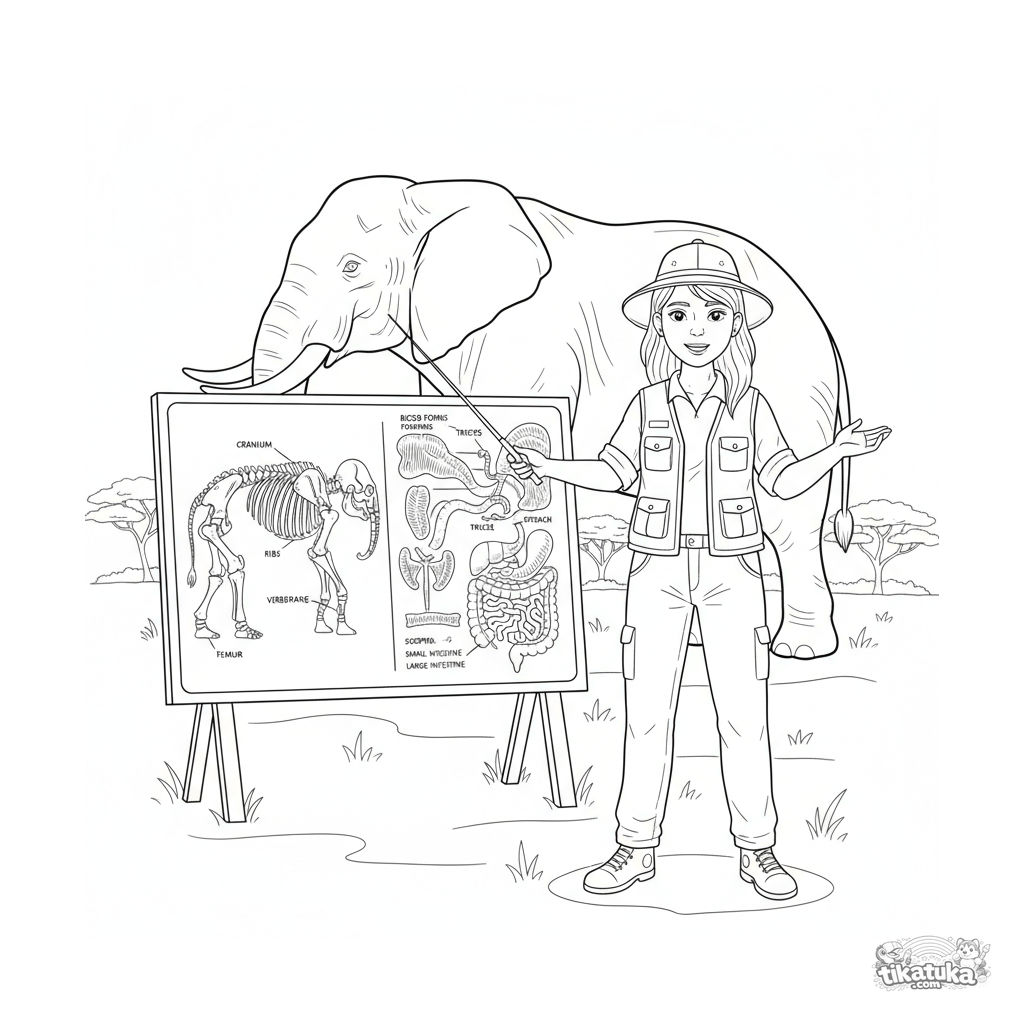 Página para colorir para crianças de 10-12 anos: um zoólogo em um painel detalhado de anatomia de elefante no zoológico. Cena educativa intrincada.