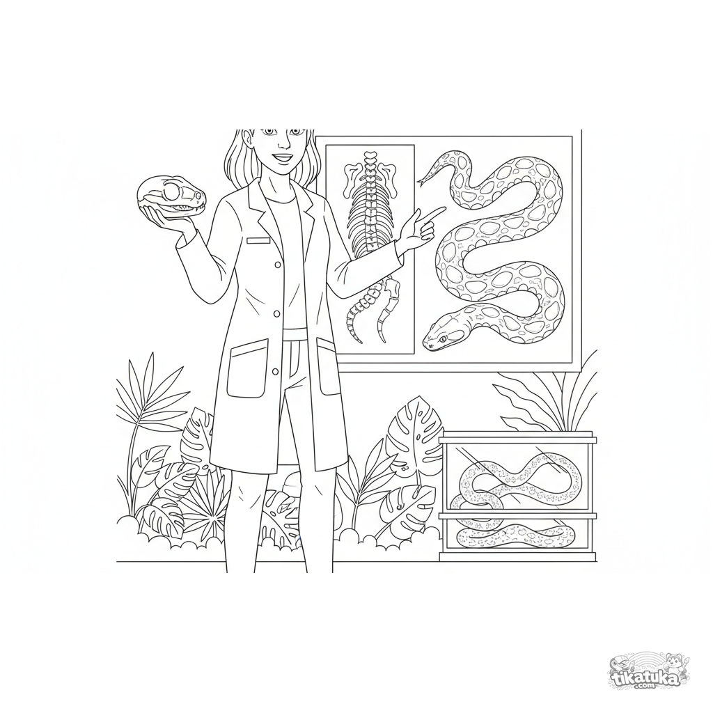 Página para colorir para crianças 10-12: um zoólogo em um painel educativo do zoológico explica a anatomia de uma cobra usando uma imagem de raio-X do esqueleto. Ilustração científica detalhada.