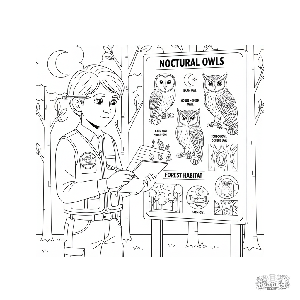 Página para colorir para crianças de 10-12 anos: um jovem zoólogo faz esboços anotados em um cartaz informativo sobre corujas. Cena educacional detalhada para amantes da natureza.