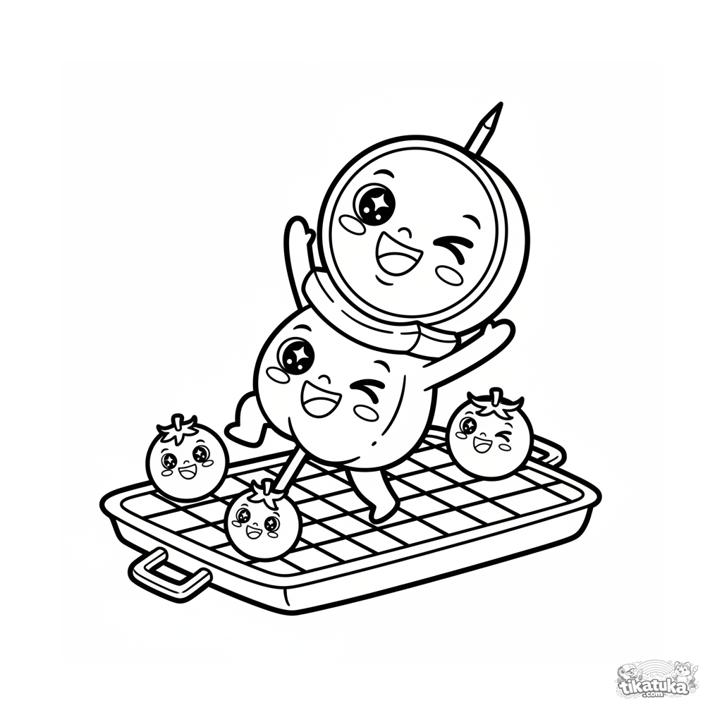 Página simples para colorir para crianças de 2-3 anos: um espetinho de legumes na grelha. Formas grandes e claras de abobrinha e pimentão dançando.