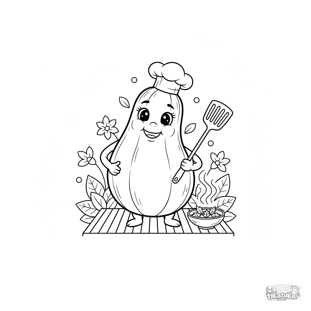 Página para colorir para crianças 4-6: uma abobrinha sorridente com chapéu de chef cozinha em uma churrasqueira de jardim.