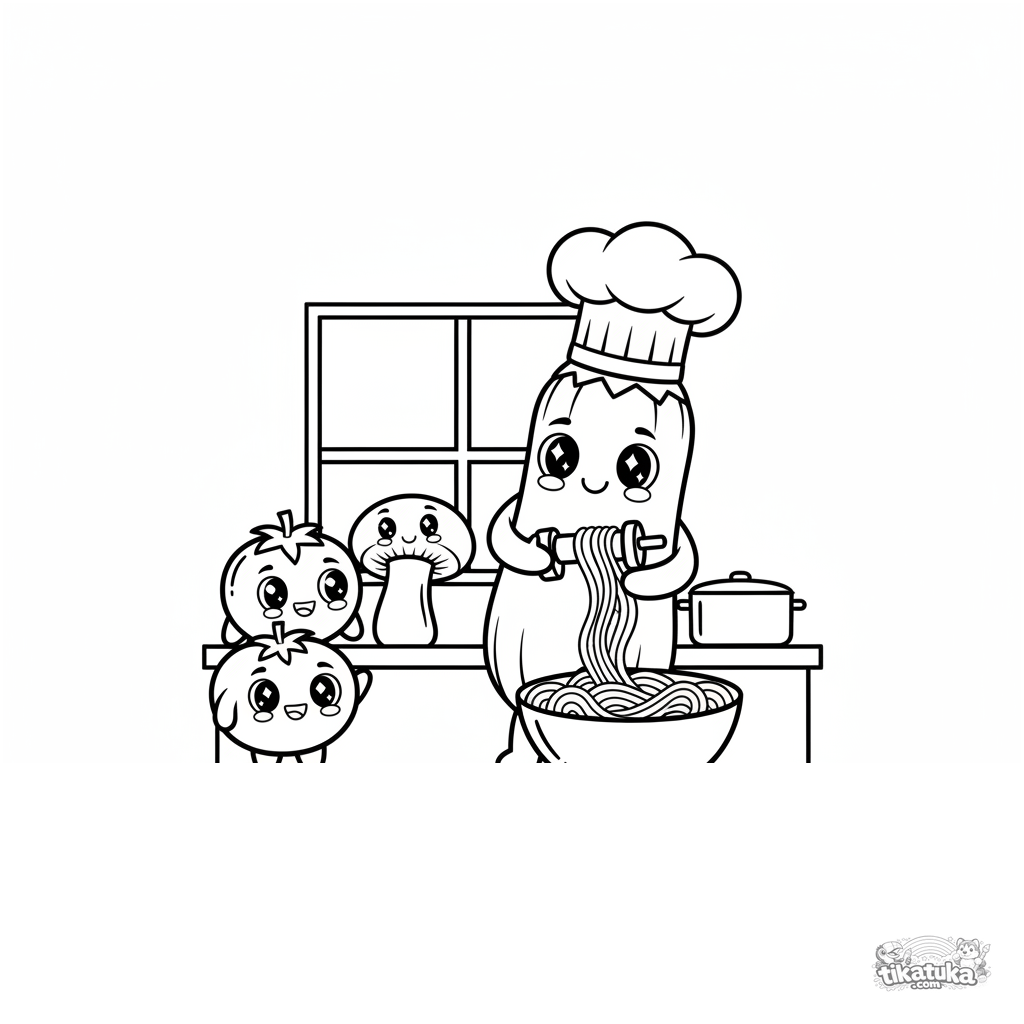 Página para colorir para crianças 4-6: uma abobrinha alegre com chapéu de chef se transforma em macarrão na cozinha. Estilo vetor plano.