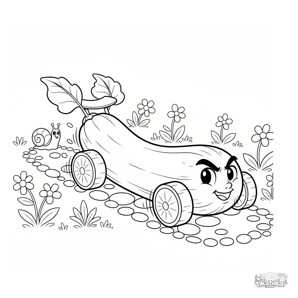 Página para colorir: uma abobrinha carro de corrida em uma trilha de jardim. Para 7-9 anos. Um caracol compete atrás.
