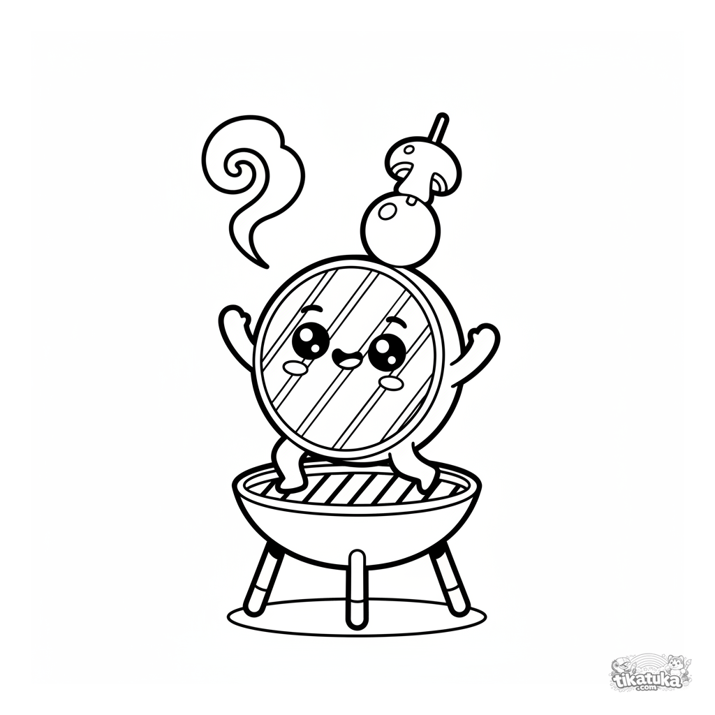 Página simples para colorir para crianças 2-3: um espetinho de abobrinha feliz dança em uma grelha de jardim. Formas grandes, poucos detalhes.