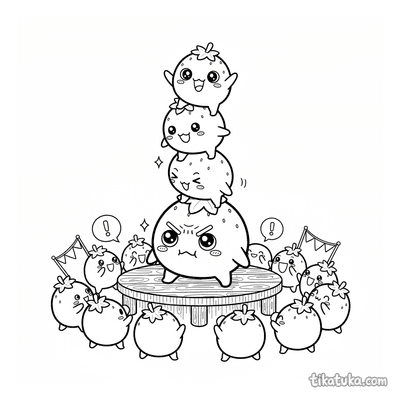 Acrobatas Mochi Construindo uma Torre de Frutinhas