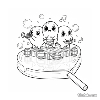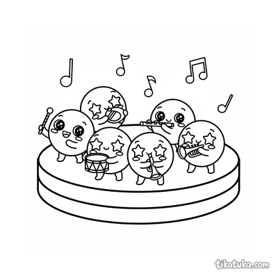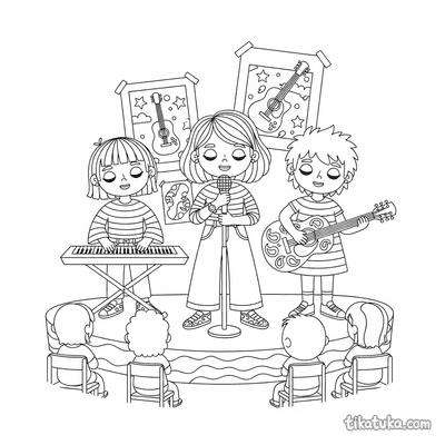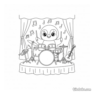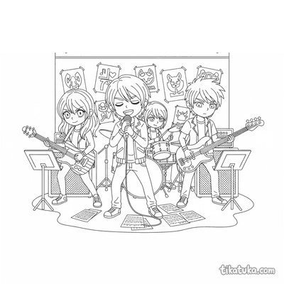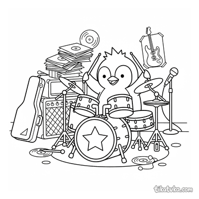 Aqui você encontra bandas em ação, como uma banda emo-lite tocando em um clube ou ensaiando, e uma banda punk diante de uma parede de graffiti. Também há músicos animais divertidos, incluindo um pinguim e um coelho bateristas, um pombo com trompete e um camaleão trompetista. Todas as 13 ilustrações estão em preto e branco, com traços nítidos ideais para colorir. Você pode baixar e imprimir as páginas em casa de forma gratuita, ou usar a ferramenta online para colorir diretamente no site.