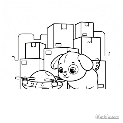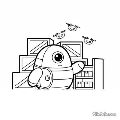 As crianças encontrarão cenas variadas, como um menino construindo um forte de caixas de papelão, robôs zeladores e cães robôs organizando ou buscando caixas em um armazém, e caminhões descarregando suprimentos. Há também robôs exploradores curiosos e carregadores empilhando caixas, criando um universo lúdico para colorir.