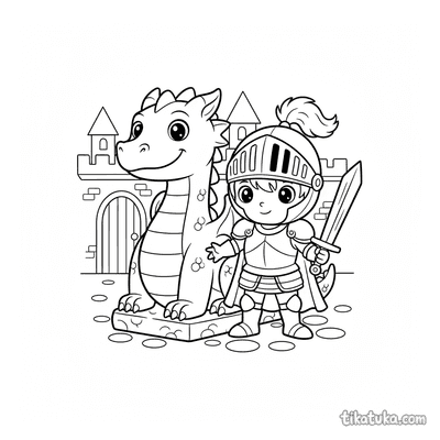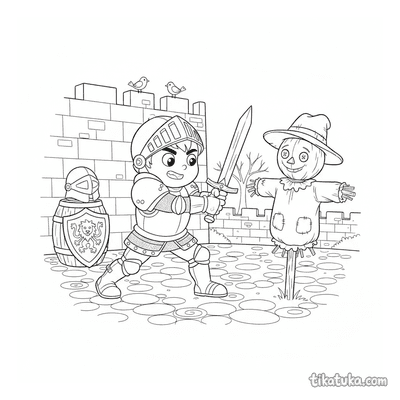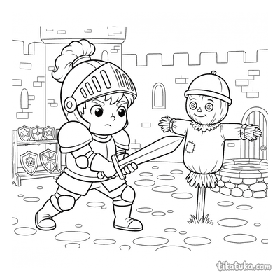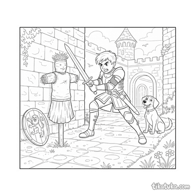 Entre as páginas, encontrará cenas de jovens cavaleiros a praticar com espadas de madeira no pátio, a guardar o portão ou junto ao poço. Há também ilustrações de princesas, bestas a cuidar de rosas e kucyks fantasiados de cavaleiros e princesas, todos em ambientes de castelo. Pode baixar e imprimir qualquer um destes desenhos com traços limpos, ideais para colorir. É uma forma prática de ter uma grande variedade de temas medievais sempre à mão, para imprimir em casa sempre que precisar.