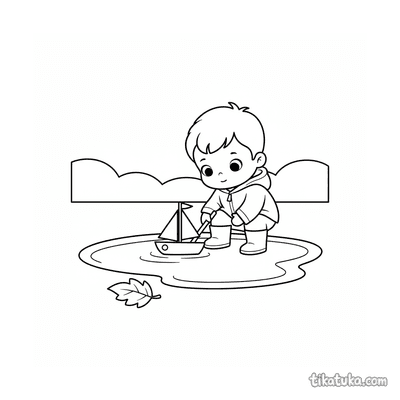 Criança pequena com barco de brinquedo em uma poça
