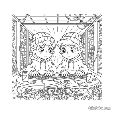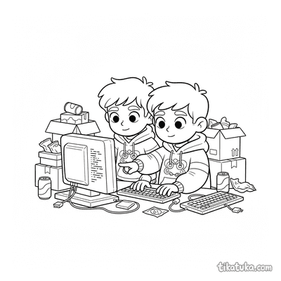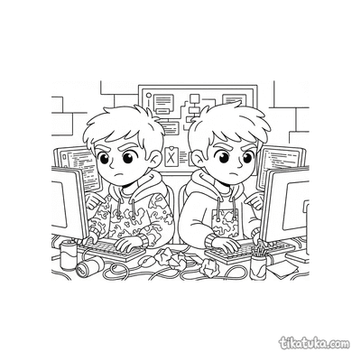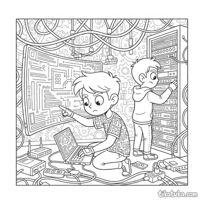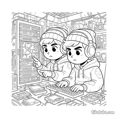 Entre as cenas disponíveis, você encontra duplas de hackers trabalhando em terminais retro ou em porões, um colecionador dedicado a computadores antigos em sua oficina e até animais, como um coelho, um shiba inu, um papagaio e uma lhama, interagindo com telas e chats bagunçados. Estas páginas oferecem uma variedade de situações, desde a manutenção de hardware por um trio até momentos de caos digital protagonizados por bichos. Todas as ilustrações estão prontas para serem baixadas e impressas em casa, uma de cada vez ou em lote, para horas de diversão. Os contornos são limpos e bem definidos, ideais para as crianças colorirem com lápis ou giz de cera, explorando cada detalhe dessas cenas tecnológicas.