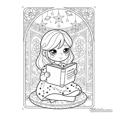 Menina Vestida de Constelação Lendo Livro Sob Estrelas de Papel