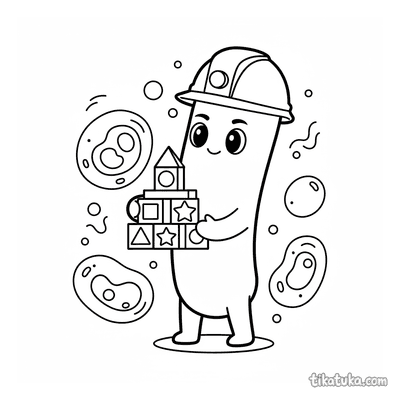 Entre os desenhos, você encontra canteiros de obras animados, como a construção da casa de gengibre, e uma variedade de máquinas e veículos. Há caminhões basculantes, rolos compressores vintage e até micróbios e bactérias em versões lúdicas, construindo torres com blocos. Todas as páginas oferecem contornos nítidos em preto e branco, perfeitos para as crianças preencherem com cores. Você pode baixar e imprimir os 38 desenhos de forma individual ou em pacote, para ter uma longa atividade de colorir sempre à mão.