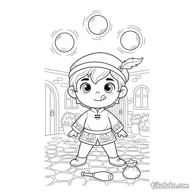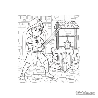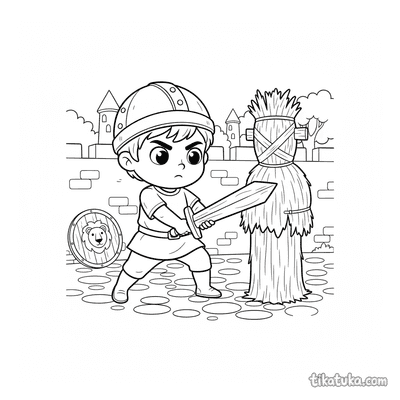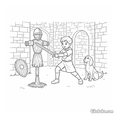 Os desenhos mostram jovens cavaleiros praticando esgrima com espadas de madeira, treinando com bonecos de palha ou descansando no pátio do castelo. Cenas mais descontraídas incluem filhotes de cachorro perseguindo o próprio rabo ou bolhas de sabão, e um menino malabarista com suas orbes brilhantes. Você pode baixar e imprimir qualquer uma destas páginas com traços limpos e definidos, ideais para lápis de cor ou canetinhas. É uma coleção prática para quem busca várias opções de uma vez, perfeita para imprimir em bloco para uma tarde de atividades.