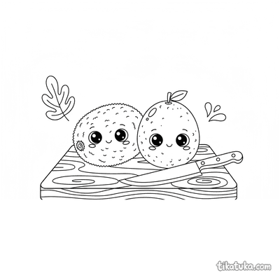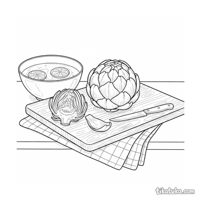 Nas imagens, você encontra cenas como um abacaxi sendo fatiado, uma alcachofra inteira e pimentões repousando sobre a superfície da tábua. Há também combinações de frutas, como kiwi com maracujá, e detalhes como uma fatia de figo ao lado de uma faca. Todas as 11 páginas para colorir estão disponíveis para baixar ou imprimir em lote, facilitando a preparação de uma sessão de pintura.