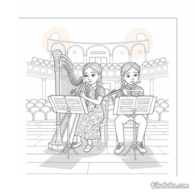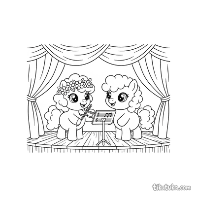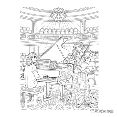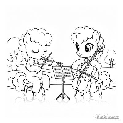 Aqui você encontra duetos de pianistas e violinistas, harpas e flautas, e até jovens violoncelistas em ensaio. Também há duplas de pôneis no palco, donuts marchando e sushi rolls comemorando, trazendo uma variedade de cenas encantadoras e engraçadas. Todas as 13 páginas para colorir estão disponíveis para baixar e imprimir em casa, ideais para projetos em grupo ou para colorir online. Os traços limpos e definidos facilitam para as crianças preencherem com suas cores favoritas.