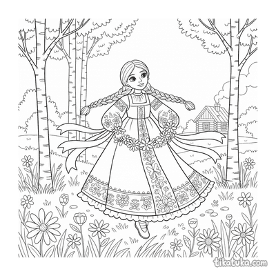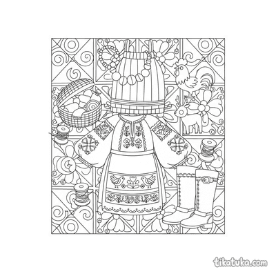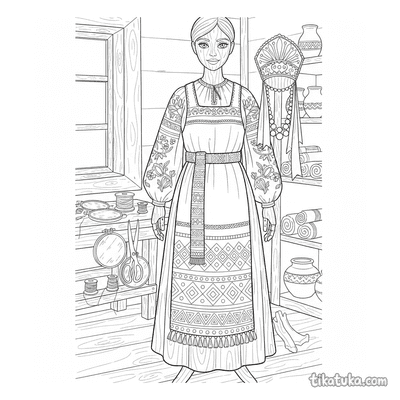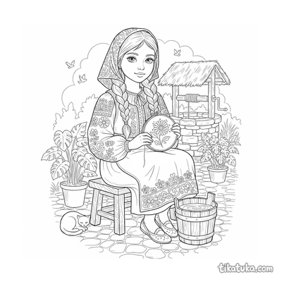As páginas incluem cenas como uma menina bordando junto a um poço, vestidos e aventais decorados com bordados de hera e motivos florais, e arranjos planos de blusas e sarafans tradicionais. Você pode baixar e imprimir estas ilustrações com traços limpos, ideais para colorir com lápis ou giz de cera. É uma forma prática de ter uma variedade de temas de bordado para atividades em casa ou na sala de aula.