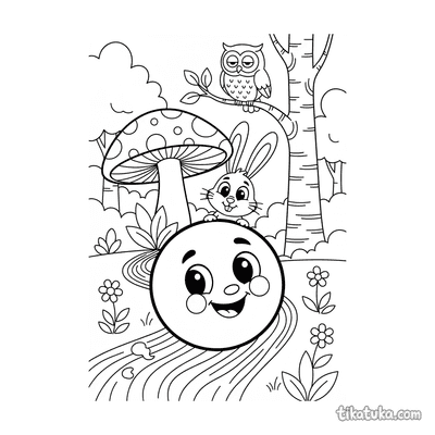 Kolobok rolando pela trilha da floresta