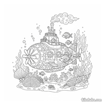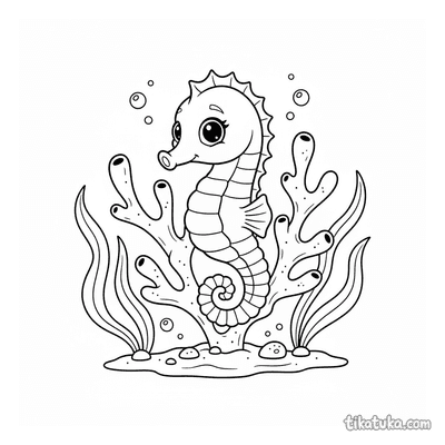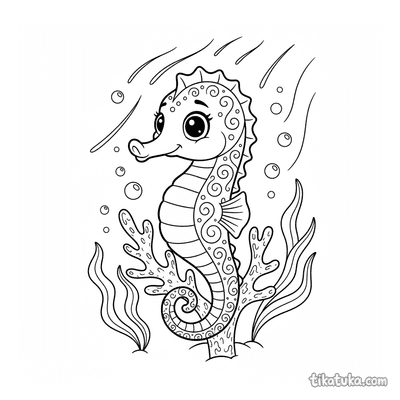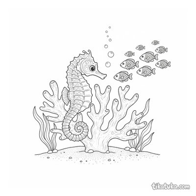 As páginas para colorir incluem cenas como um papagaio-do-mar com peixes na beira de um penhasco, um cavalo-marinho enrolado em coral e até um submarino a vapor explorando um recife. Também há imagens mais criativas, como um cavalo-marinho maestro regendo uma orquestra subaquática. Todas as ilustrações têm contornos nítidos em preto e branco, ideais para serem impressas em casa ou coloridas diretamente no ecrã. É uma forma prática de ter uma grande variedade de desenhos de peixe sempre à mão para os mais novos.