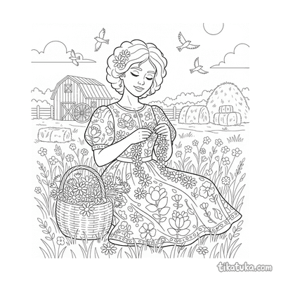 Encontre aqui ilustrações de aventais com bordado folclórico, blusas tradicionais e sarafans em manequins, além de crianças vestindo esses trajes enquanto dançam, bordam ou participam de festas na vila. As cenas incluem momentos como trançar guirlandas, buscar água no poço ou celebrar a colheita, sempre com os detalhes característicos da indumentária. Estes 21 desenhos em preto e branco têm contornos nítidos, ideais para imprimir em lote para uma turma ou para colorir diretamente no ecrã. Cada página oferece uma oportunidade para explorar os padrões e elementos decorativos dos trajes folclóricos.