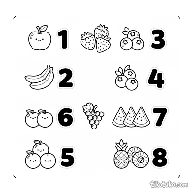 Esta coleção apresenta desenhos de frutas em preto e branco, perfeitos para atividades infantis. As páginas incluem uma variedade de frutas em contextos divertidos e educativos.