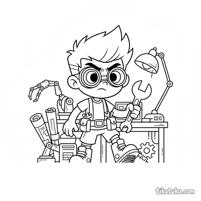 Herói inventor consertando cachorro robô no laboratório
