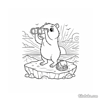 Capivara com binóculos em um mirante ao pôr do sol