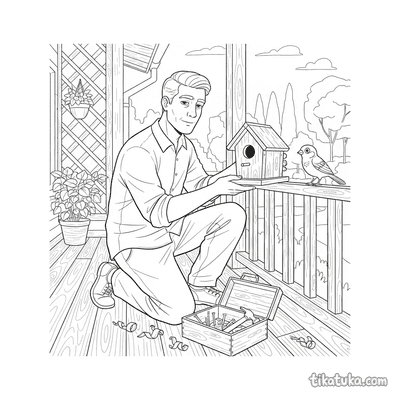 Homem consertando casa de pássaro no corrimão da varanda
