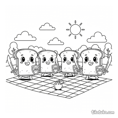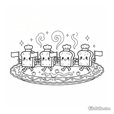 Aqui você encontra uma parada animada de personagens inusitados, como uma dupla de donuts, uma xícara de chá e uma fatia de torrada marchando. Cenas como soldados de torrada no cobertor, uma banda de torta na mesa e amigos onigiri com sua bandeira de alga compõem este desfile criativo. Todas as ilustrações estão em preto e branco, com traços bem definidos que facilitam o preenchimento. Você pode baixar e imprimir estas páginas em lote para atividades em grupo ou colorir diretamente no site, aproveitando os contornos limpos ideais para lápis de cor e giz de cera.