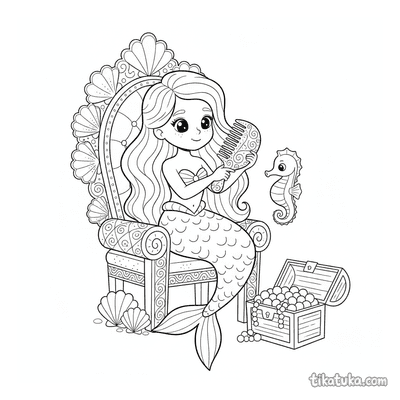 Entre as páginas, você encontrará uma sereia sentada em uma rocha penteando o cabelo, princesas sereias em tronos de coral decorados e cenas com elementos como golfinhos, espelhos de concha e muszli. As ilustrações oferecem uma variedade de detalhes, desde os longos cabelos até as escamas da cauda, perfeitas para explorar diferentes cores e texturas. Você pode baixar e imprimir todas as 17 páginas de uma vez para ter um livro de colorir completo sobre o tema. Os contornos em preto e branco são nítidos, ideais para lápis de cor, giz de cera ou até para colorir online diretamente no seu dispositivo.