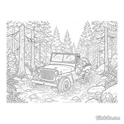 Jipe da Segunda Guerra Cruzando um Riacho na Floresta