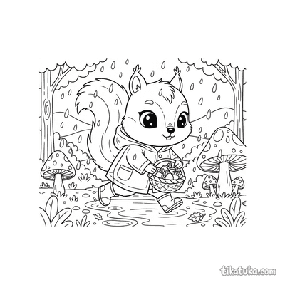 Esquilo coletando nozes com capa de chuva