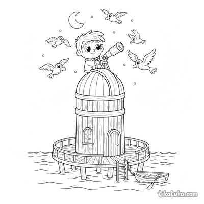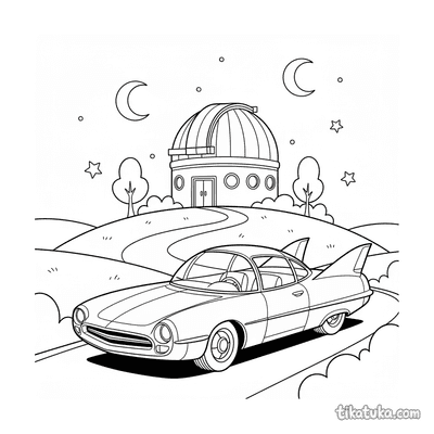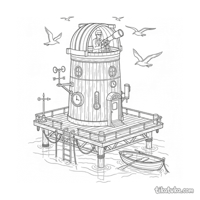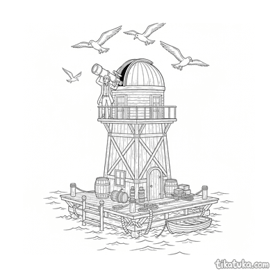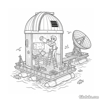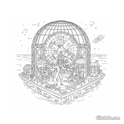 Entre as cenas para colorir, encontram-se observatórios flutuantes no mar com suas cúpulas características, plataformas de pesquisa e personagens como uma princesa astrônoma. Há também elementos retro-futuristas, como carros foguete, e detalhes celestes, como vestidos com constelações, que compõem este universo temático. Todas as 15 ilustrações estão disponíveis para baixar e imprimir em preto e branco, com traços nítidos ideais para pintura. É possível imprimir várias páginas de uma vez para criar uma atividade contínua ou colorir diretamente no ecrã, explorando diferentes paletas.