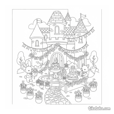 Aqui você encontra cenas como uma festa no jardim do castelo, uma procissão de lanternas cruzando uma ponte e uma menina decorando uma grinalda festiva. Também há personagens em clima de comemoração, como uma lagarta com chapéu de festa, uma coruja enfeitando uma árvore e uma menina segurando balões. Cada desenho traz um momento único de diversão para ser pintado. Nossa coleção de desenhos de festa em preto e branco oferece contornos nítidos, ideais para imprimir em casa ou pintar diretamente na tela. Você pode baixar todas as páginas de uma vez para ter uma atividade pronta ou escolher as favoritas para uma tarde criativa.