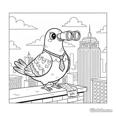 Aqui você encontra pombos em cenas peculiares, como um pombo dramático apontando para um balde de pipoca derramado, um colecionador de fitas rechonchudo ou um pombo bobo inspecionando um espantalho. Também há cenas mais ternas, como um pombo guiando um filhote ou construindo seu ninho numa cesta de fios. Todas as 51 ilustrações estão em preto e branco, com traços bem definidos que facilitam o preenchimento pelas crianças. Você pode baixar e imprimir quantas cópias quiser para uma tarde de diversão, ou colorir diretamente na tela se preferir.